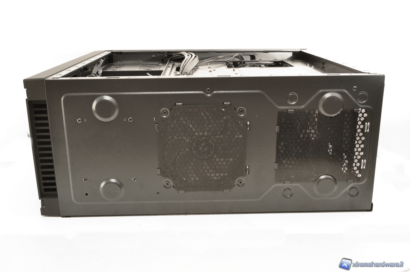 La base del case consente l’installazione di una ventola in immissione da 120mm, mentre l’altra griglia è destinata all’alimentatore che può in tal modo aspirare l’aria fresca dall’esterno del case ed espellere quella calda all’esterno della struttura. Questa soluzione permette di avere per l’alimentatore un flusso d’aria indipendente dal resto del pc. Sempre sul fondo troviamo due filtri antipolvere per le rispettive griglie e 4 piedini.